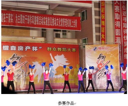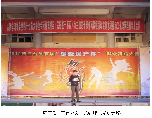 由四川省耀森房地产开发有限公司独家冠名赞助的“2012年三台县首届‘耀森房产杯’群众舞蹈大赛”,于3月16日、17日在三台县文化馆隆重举行。耀森房产三台分公司龙光明总经理在决赛晚会现场做了热情洋溢的发言。龙总提出,四川省耀森房地产开发有限公司作为三台的知名企业,多年来一直致力于群众公益事业,本次舞蹈大赛是我公司以实际行动落实县委县政府提出的文化强县战略,促进三台文化大发展、大繁荣、丰富人民群众精神文化生活的重要活动。公司在今后的发展中,将以多种形式继续支持群众性的公益文化活动建设,提高群众精神文化生活质量。