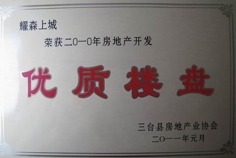 2011年1月11日,三台县房地产协会2010年年会顺利召开,会上表彰了全县2010年度房地产开发优秀企业、优质楼盘、物业服务优秀企业、房产经纪优秀中介机构,四川省耀森房地产开发有限公司的“耀森·上城”以一流的品质获得了“2010房地产开发优质楼盘”称号。