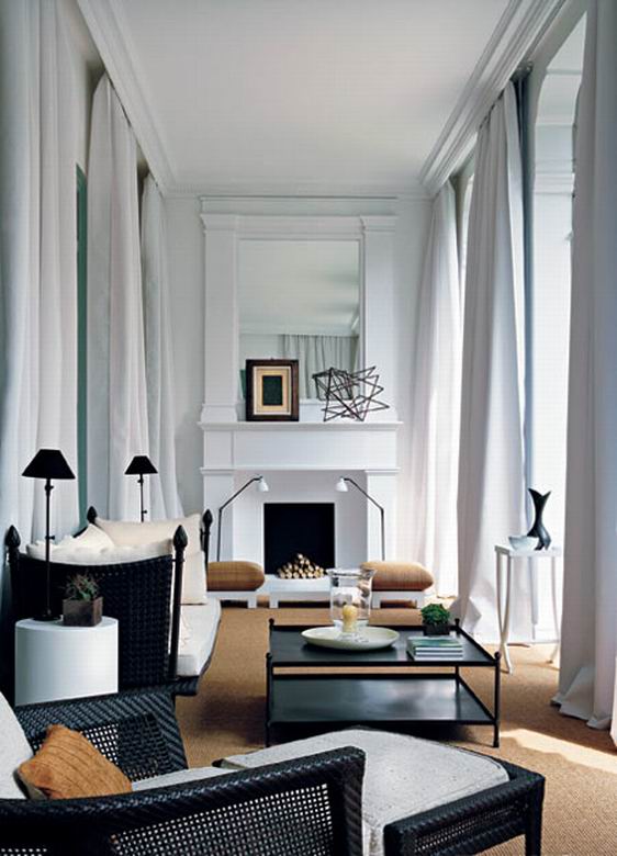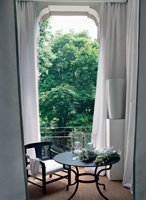 在主卧室的设计中,设计师Stefano Dorata玩味着黑与白的反差。白色窗帘和被白色丝绸所覆盖的双人床,层层叠叠又极度素净。如此一来,灯饰和长椅便成为了这白色上的点滴墨色,既沉稳又活跃。有着细微色差的人字形木条镶嵌的栎木地板,丰富了这个黑白色调房间的肌理。而床角那个出自设计师之手的黑色皮革长凳,则在非常洗练的造型之上又充满精细的纹饰。配以18世纪的法国矮柜和上世纪六十年代的扶手沙发,使整个房间充满了白色的轻盈与历史的醇厚。
