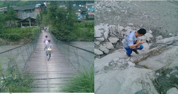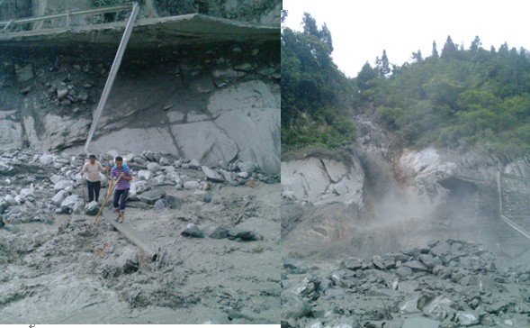 由于道路断道,山体滑坡严重,公司的车只能将柴油送到宋家大院的桥上,我们再用自带的绳子将装满柴油的油箱捆绑好,从宋家大院出发,一侧山陵绵延起伏,一侧水势汹涌澎湃,且随时可能有塌方和泥石流发生。公路已经被泥土石头淹没,行走十分艰难,稍不注意脚便陷入深深的泥泞,再难拔出来。硬邦邦的绳子无情的将我们的肩膀勒得通红,并不遥远的路途显得漫长而艰难,经过重重困难,在中午才到达了电站。